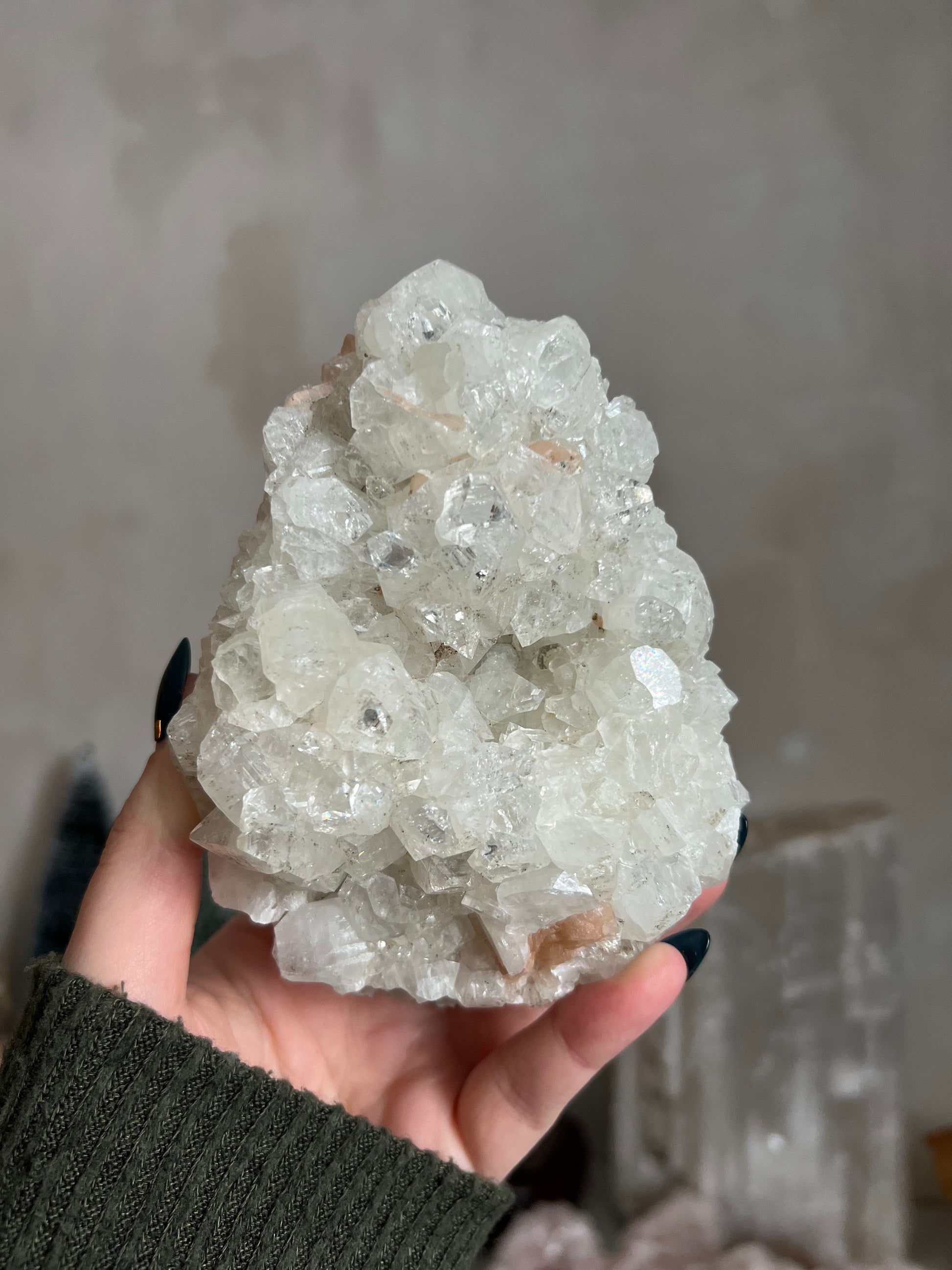 This cluster has a mix of cubic formations and super clear points with mirror like reflection.